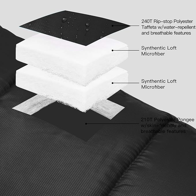 - Water Resistant & Comfort: Lining adopt 240T Rip-stop Polyester Taffeta water-repellent and breathable features, it effectively increases the toughness of the sleeping bag. and with double layer synthetic loft microfiber,provides greater comfort for your body.