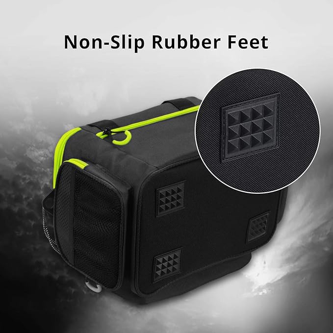 - Tough and Water Resistant – Calamus fishing tackle bags are made from tough, 600D rip-stop PE material. Durable composite clips to provide exceptional long-term performance and reliability. The inner PVC layer provides protection to ensure your fishing tackle is protected from the elements even as a saltwater tackle bag. A durable 600D PE PVC coated bottom repels moisture and the tacky rubber feet grip any surface so the bag doesn’t slide around inside your boat.