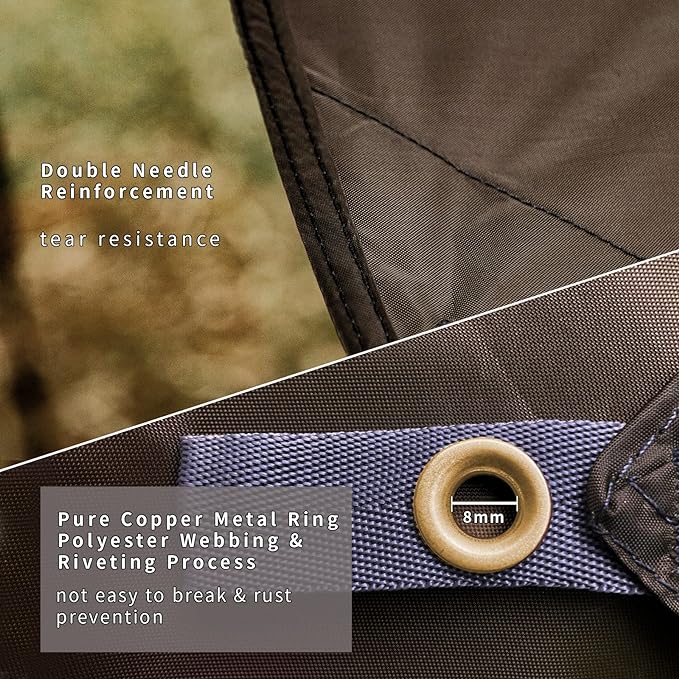• Durable & Tear-Resistant: Unigear hammock rain tarp is made of 210D polyester oxford fabric, which has a higher textile density than ordinary 210D polyester. The fabric splicing place adopts double needle reinforcement design, which makes the camping tarp more durable and tear-resistant. A total of 8 polyester webbings enhance the stability of the edges and the ground and create more possibilities for setting up