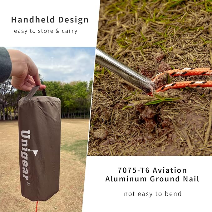 • Outstanding Quality Accessories: Unigear rain fly equipped with 6 high strength 7075-T6 aviation aluminum ground nails which is high strength. 6 of 3.5mm thick wind ropes, not easy to break and good rust prevention pure copper metal ring. It is not easy to fall off through riveting pressing process, and the high quality accessories can extend the service life of the hammock tarp