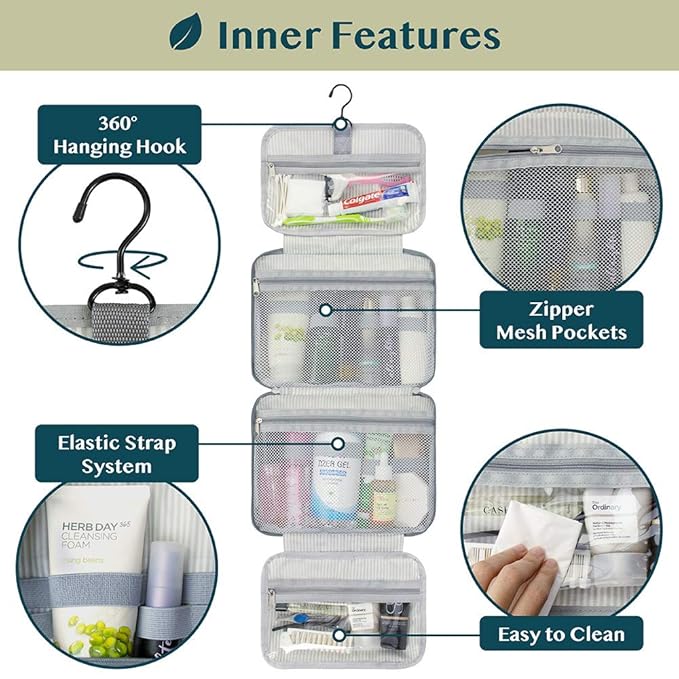 - HANGING COSMETICS TRAVEL BAG ORGANIZER: This toiletry bag for women has a hanging hook and multiple pockets that help you stay organizer during business trip, vacation travel. The hanging hook makes it easy to hang the toiletry bag to bars in the hotel shower bathroom. Unzip your toiletry bag to reveal compartments to organize your shampoo, skincare face hygiene products. This toiletry travel bag is an essential accessory for cruise in Europe, plane, Hawaii Trip, and honeymoon.