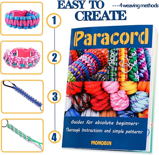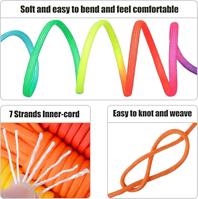 - Wide Range Of Uses: You can use it for craft activities, cultivate kids' hands-on ability, and make paracord projects. Braid paracord bracelets, lanyards, dog collars, necklaces, bag straps, coasters, etc. Our high-quality paracord is also very suitable for outdoor use. This kit is also the perfect choice for gifts. Rich colors and accessories are suitable for men, women, kids and users of all levels