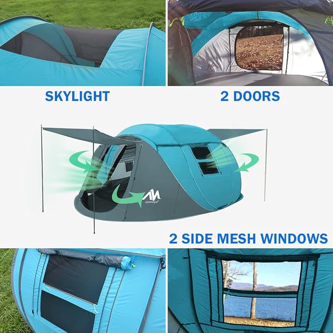 4 Person Pop Up Tents for Camping - AYAMAYA Waterproof Instant Family Tents with Skylight & Removable Rainfly, Upgraded Large Size with 2 Doors -Automatic Easy Setup Beach Tent with Poles