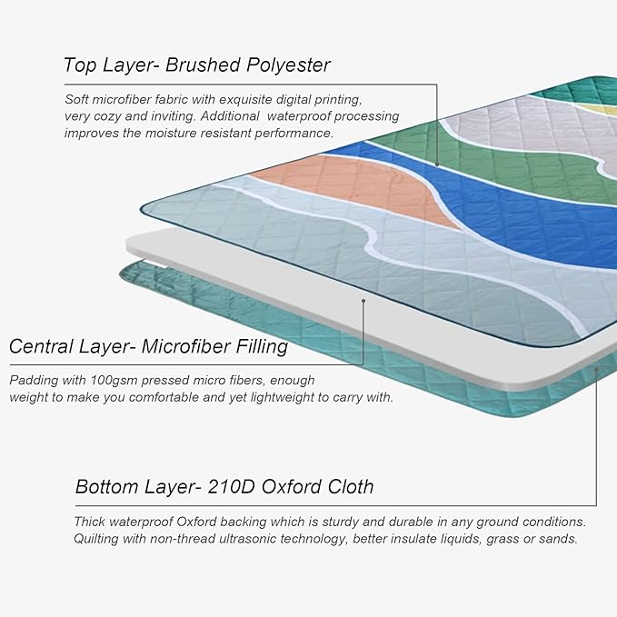 - Three Layers: Made of multi layers materials with ultra sonic quilting technology. Soft brushed fabric on the top, padding with pressed microfibers, and sturdy 210D oxford cloth as backing. Both the top and bottom are processed with waterproof finish,non thread sewing further improves the moisture performance, and better insulates grass or sands