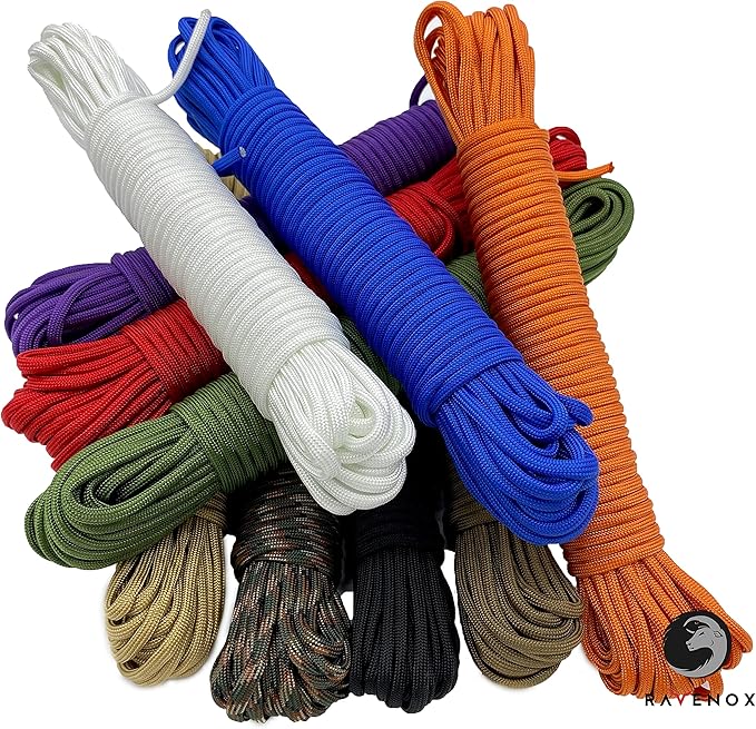 - ✔ COLORED NYLON PARACORD: Our GENUINE 550 Cord measures 5/32-inches in diameter and is available by the foot at 25 Feet, 50 Feet and 100 Feet lengths. Full spools of 1000 Feet are also available for big projects. Ravenox Paracord is available in multiple colors to fit your project or application.