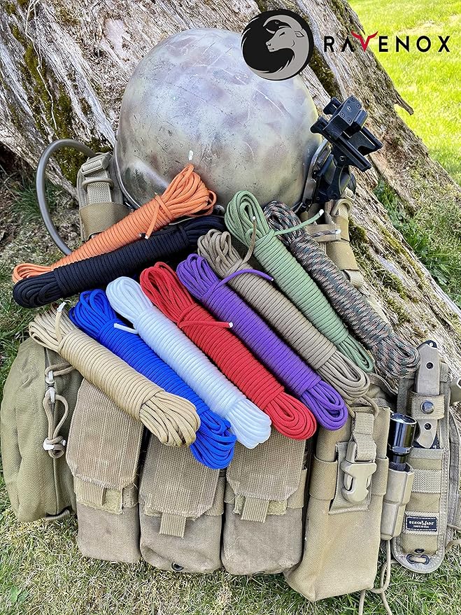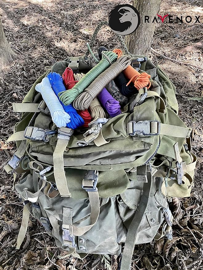 - ✔ 550-CORD FOR MILITARY AND CIVILIAN USE: Strong enough for use by NASA and the military, our paracord is also perfect for everday civilian uses. All-weather Ravenox paracord is the perfect lightweight multi-use tool to add to your bug-out bag or backpack for your next outdoor adventure. This survival cord can be used to create fishing line, tie-downs, replace boot laces or even use the inner core as sewing thread.