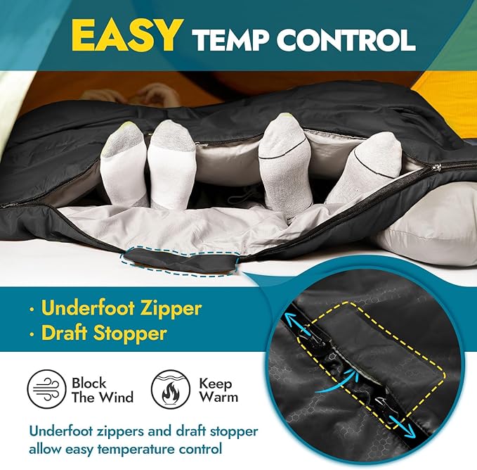 - 4 IN 1 DESIGN: Our two person sleeping bag can be separated into two individual sleeping bags if you need. Because both sides of the sleeping bag have the double-sided zipper. So it can be divided into two parts with a zipper on one side. You can also use it as a blanket when you're at home or take a nap at office when it's full opend
