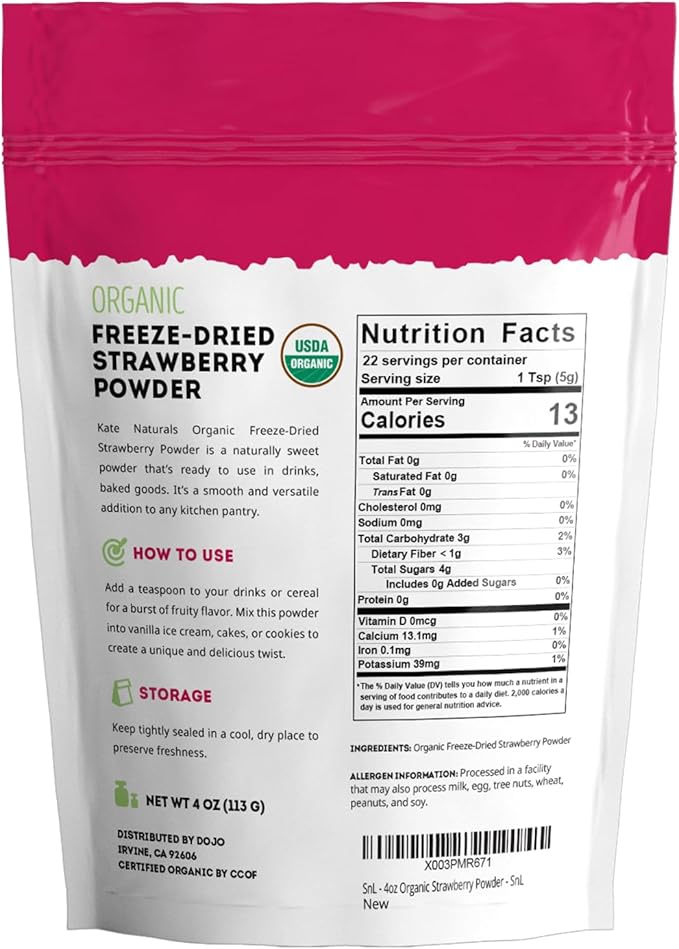 - YOU’LL LIKE THIS POWDER ‘BERRY’ MUCH: Kate Naturals Organic Freeze Dried Strawberry Powder is the perfect ingredient for your cooking and baking needs! Our powdered strawberry is natural and unsweetened, delivering the subtle and authentic flavor of fresh strawberries. This strawberry milk powder mixes well in smoothies and yogurt.