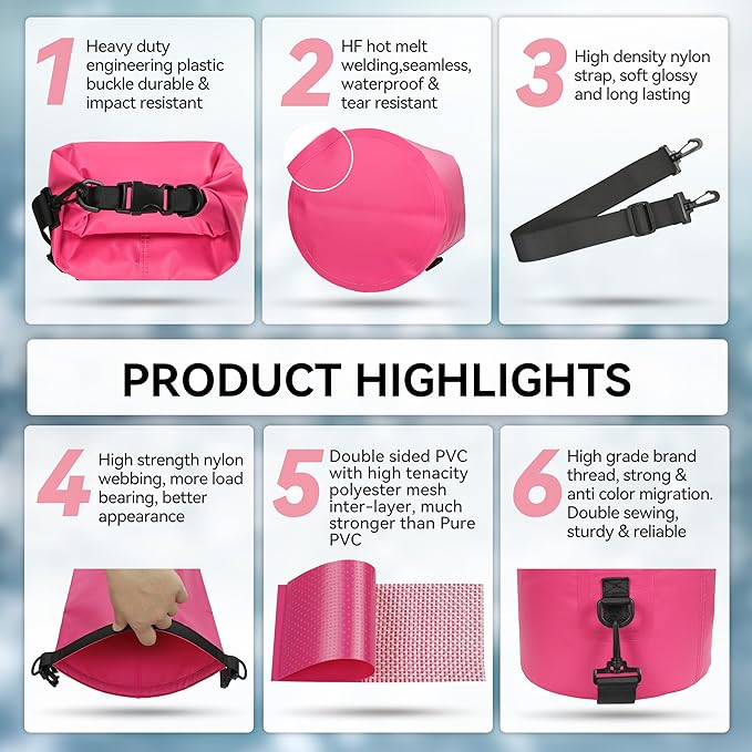• Floatable and Trackable: The dry sack can float on water without sinking after being rolled up and buckled, so you can quickly track and retrieve your stuff. The D-ring and strap on the bag make it easy to attach to the boat, keeping your stuff always with you without getting lost, allowing you to enjoy thrilling outdoor activities with peace of mind.