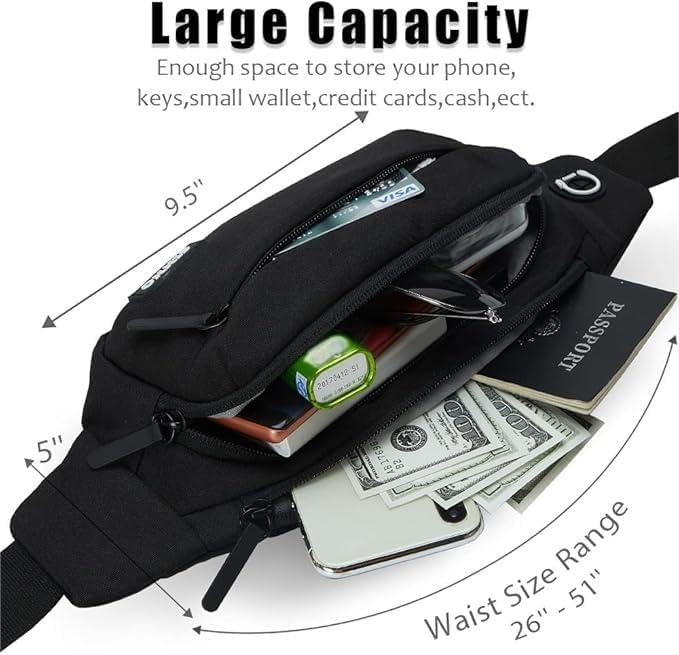 • 【Best Gifts for Men Women】Our fanny pack size is about 13.5"x 5" x 3.5" with 4(Four) zippered pockets perfect for most people who want to be hands free to carry the most needed items,include all size of phone(iphone 13 14 pro max...), passport, keys,ID and other travel essentials. Perfect for various outdoor activities such as Running,Hiking,Shopping,Traveling,Walking Dog,Jogging,Cycling,Fishing,Going to Sporting Events,Themepark,Day Trips,etc.A great Gift for Women Men Kids and Family.