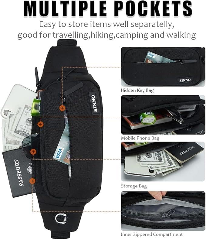 SINNO Large Crossbody Fanny Pack for Women Men Belt Bag With 4-Zipper Pockets for Travel Running Hiking Workout Dog Walking Outdoors Sport Fishing Waist Pack Bag Carrying All Phones