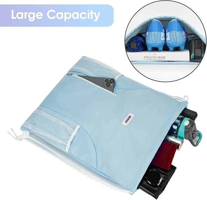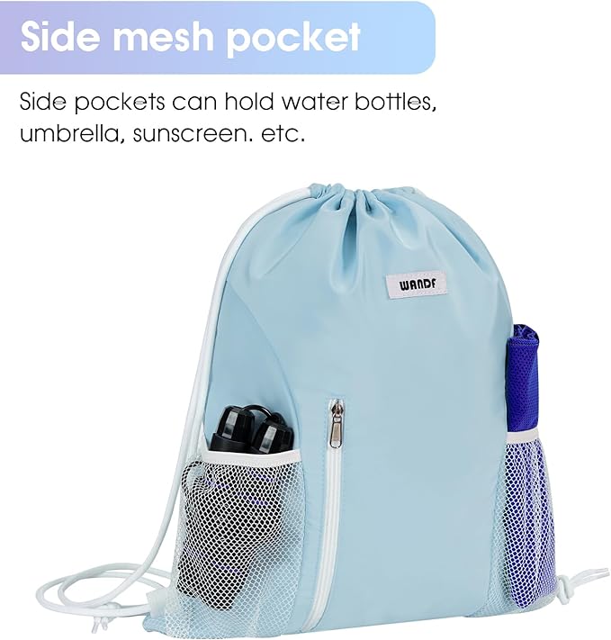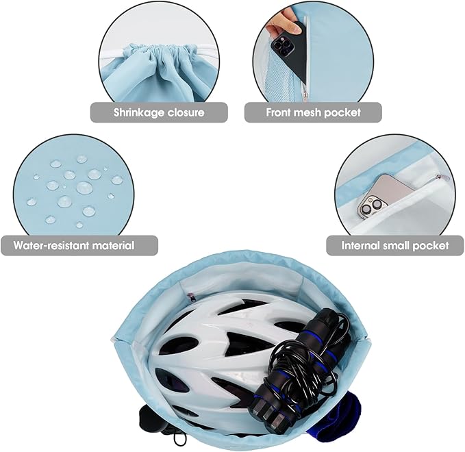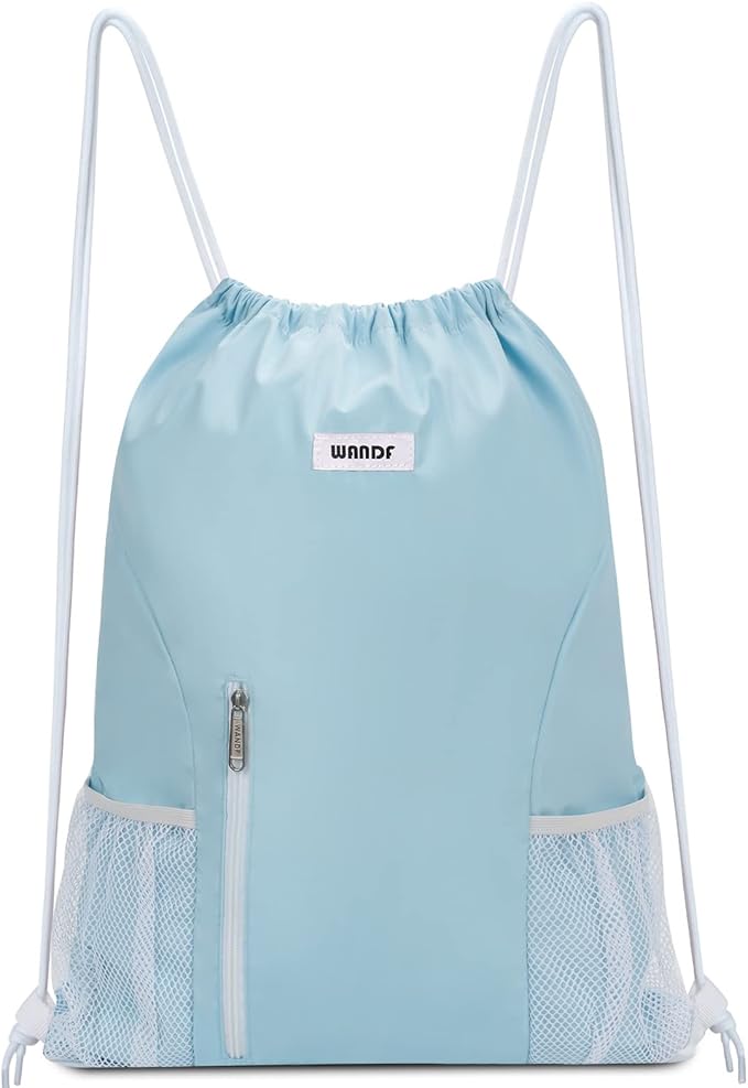 WANDF Drawstring Backpack Sports Gym Sackpack with Mesh Pockets Water Resistant String Bag for Women Men(Light Blue)