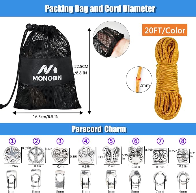 MONOBIN Micro Paracord,2mm 10Colors 20FT Paracord Combo Kit with Paracord Instructions and Charms for Making Paracord Bracelets, Lanyards, Jewelry Making