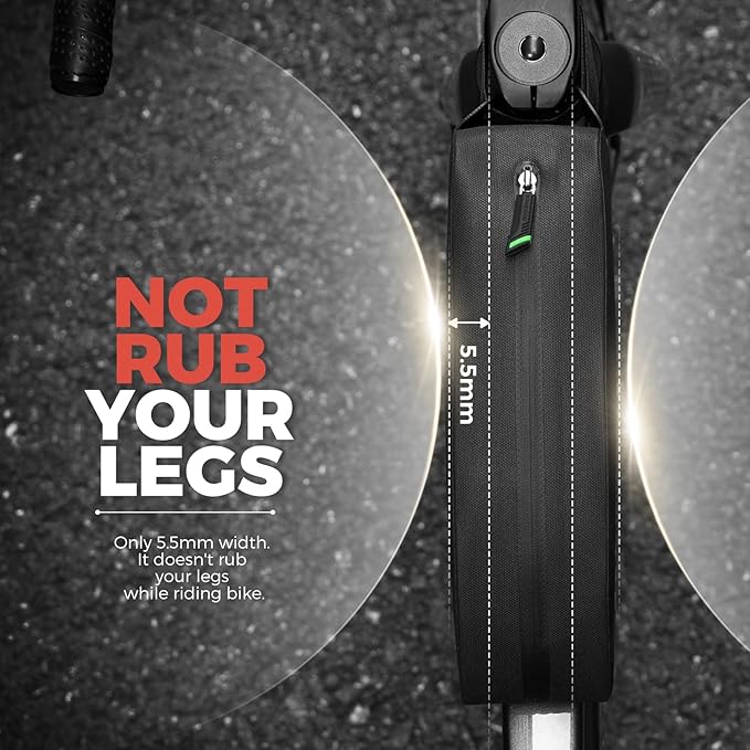 - COMFORTABLE & CONVENIENT: The front bike bag has a long slim body. Proper space design make you ride more smoothly and comfortable(Your knees will not hit the frame bike bag easily). It's portable, you can take this bike pouch easily while leaving away from your bike