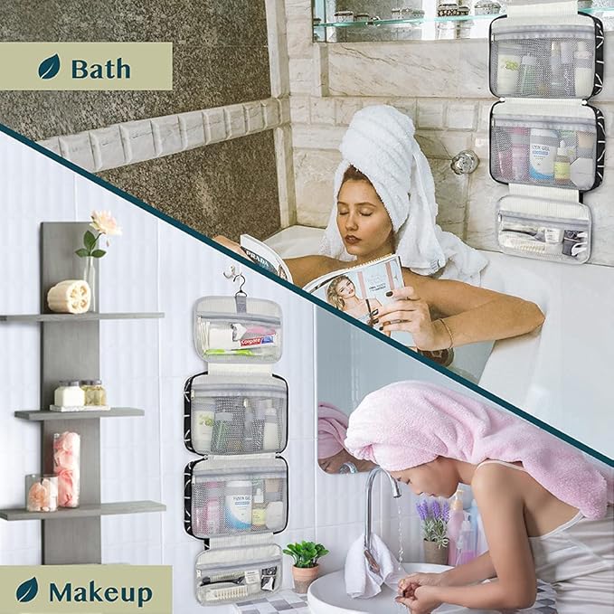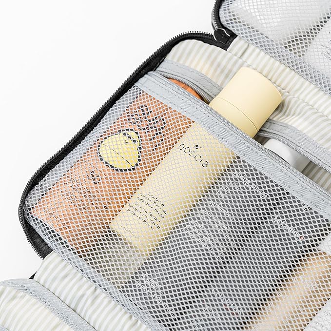 - HANGING COSMETICS TRAVEL BAG ORGANIZER: This toiletry bag for women has a hanging hook and multiple pockets that help you stay organizer during business trip, vacation travel. The hanging hook makes it easy to hang the toiletry bag to bars in the hotel shower bathroom. Unzip your toiletry bag to reveal compartments to organize your shampoo, skincare face hygiene products. This toiletry travel bag is an essential accessory for cruise in Europe, plane, Hawaii Trip, and honeymoon.