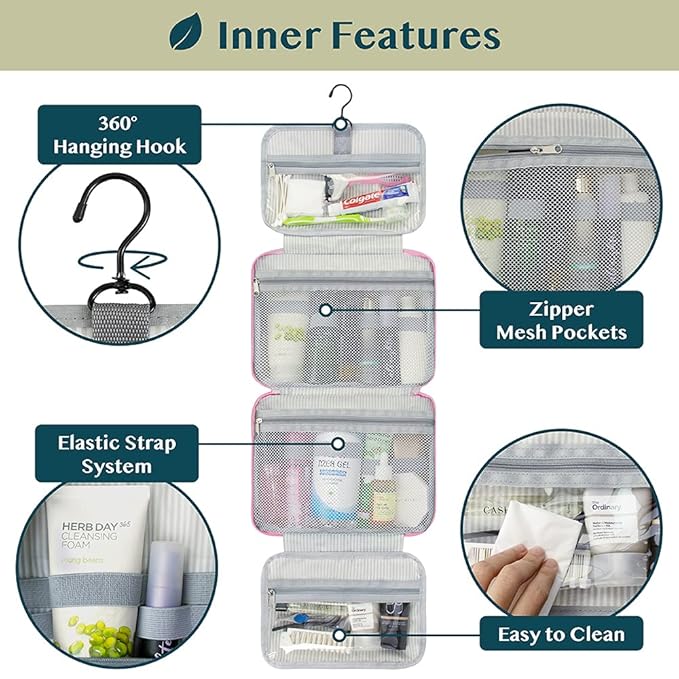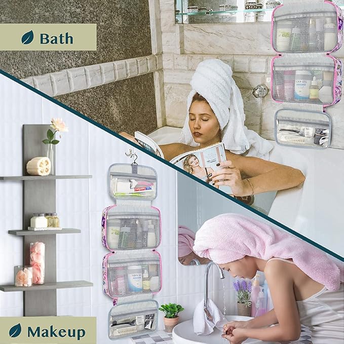 - HANGING COSMETICS TRAVEL BAG ORGANIZER: This toiletry bag for women has a hanging hook and multiple pockets that help you stay organizer during business trip, vacation travel. The hanging hook makes it easy to hang the toiletry bag to bars in the hotel shower bathroom. Unzip your toiletry bag to reveal compartments to organize your shampoo, skincare face hygiene products. This toiletry travel bag is an essential accessory for cruise in Europe, plane, Hawaii Trip, and honeymoon.