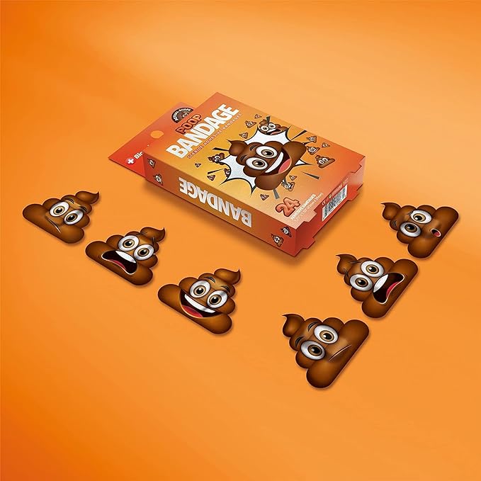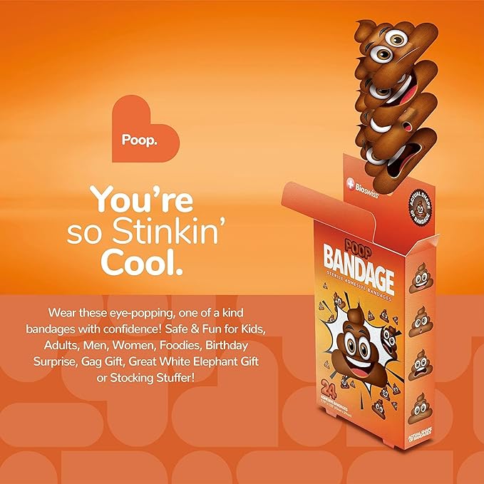 - POOP BANDAGES: This 24 piece pack of funny poo bandages is great for putting a smile on kids' faces while protecting wounds such as cuts, scrapes, and burns, and come in 4 assorted styles; sticky bandages are perfect for kids and adults alike, and also for school nurses and pediatric doctors