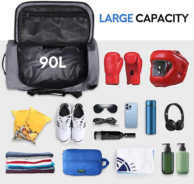 Haimont Gym Duffel Backpack Bag for Men Large Sports Duffle Bags with Backpack Straps for Hiking Travel Weekender Workout, Water Resistant, Gray, 90L