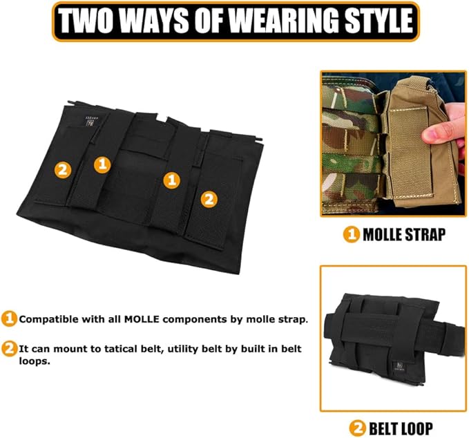 - Two different ways of wearing :1. It can mount to tatical belt, utility belt by built in belt loops. 2.compatible with all MOLLE components by molle strap .Note :If you you don't know how to use molle strap,please check the video we uploaded.