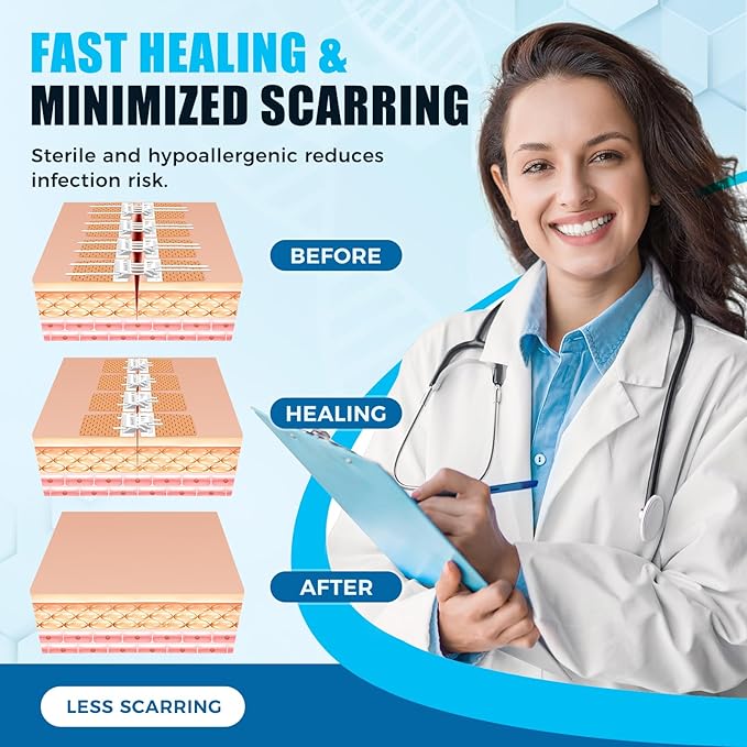 - STITCHLESS CLOSURE: Our Wound Closure is No-stitch needed, easy & painless to use. It helps reduce secondary trauma & scarring, enhances recovery & removal comfort, and effectively Reduce Scarring compared to traditional stitching. Ideal for kids or people who is afraid of traditional sutures.