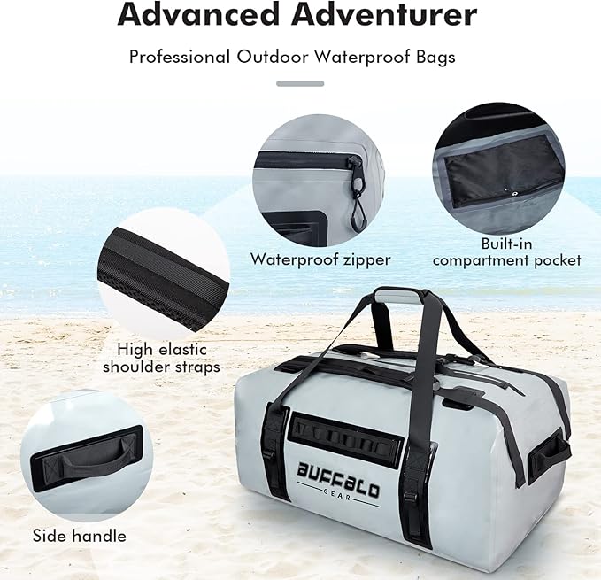 - 100% WATERPROOF: Buffalo Gear waterproof duffle bag is constructed with durable, tear-resistant, puncture-resistant 1000D Tarp, fully waterproof zipper and double-stitched construction to effectively protect against rain, snow, dust, and odors. Able to handle any extreme environment with ease