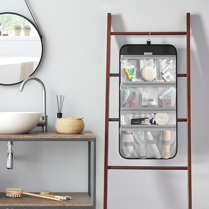 - WATER-RESISTANT & EASY TO CLEAN: Durable polyester with waterproof sections, just wipe clean. Perfect for storing travel-size shampoo, conditioner, face wash, toothbrushes, and even a full-size hairbrush. Keeps everything dry, tidy, and ready for any trip.