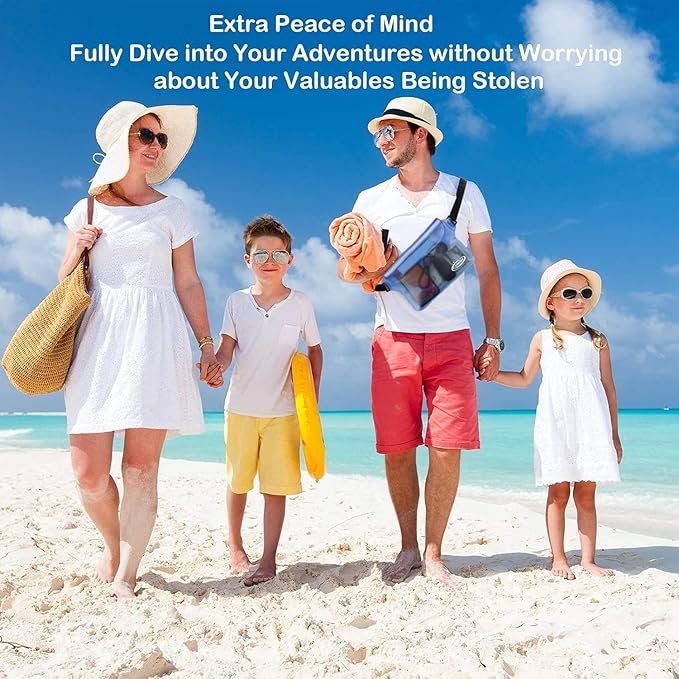 - Beach Accessories for Vacation: Waterproof Protection and Confident Impermeable! Triple zip lock protection up to 32 feet (10 meters) underwater. No worries of your valuables getting wet. Keep your phone and wallet perfectly dry and safe from a splash, a spill, or total immersion whether you're snorkeling, swimming, sailing, paddle boarding, tubing, kayaking, river rafting, water slides or water activities and the like!