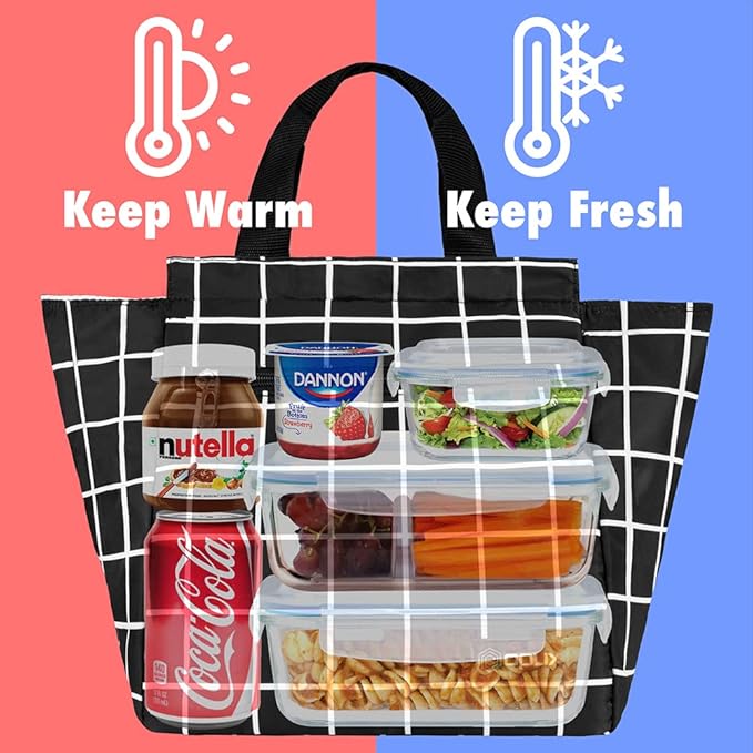 opux Lunch Bag for Women, Insulated Lunch Box Tote for Girls Kids Adult School Work, Reusable Womens Lunch Tote for Office Travel, Cute Small Lunch Tote, Fits 12 Cans - Checker Plaid Black