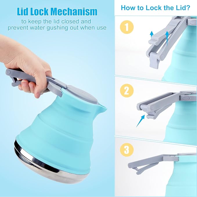 - 【Safe with Lid Lock Mechanism】The portable kettle for camping is specially designed with lid lock mechanism at the handle to keep the lid closed when pouring water. No need to worry about water gushing out any more.