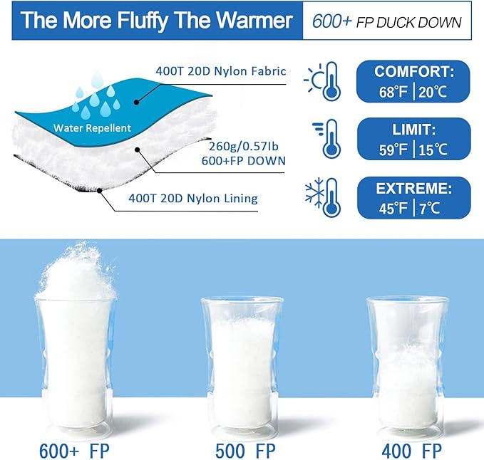 - γ ππππ ππππ γThe adult sleeping bag is filled with 260g selected duck down with 600 Fill Power, suitable for warm weather. Pure natural and healthy material, fluffy and soft, no odor or impurities. The sleeping bag specially adds a 1.6 " cloth strips for wind protection. Comfortable Temperature:59Β°F-68Β°F, Minimum Temperature: 45Β°F.