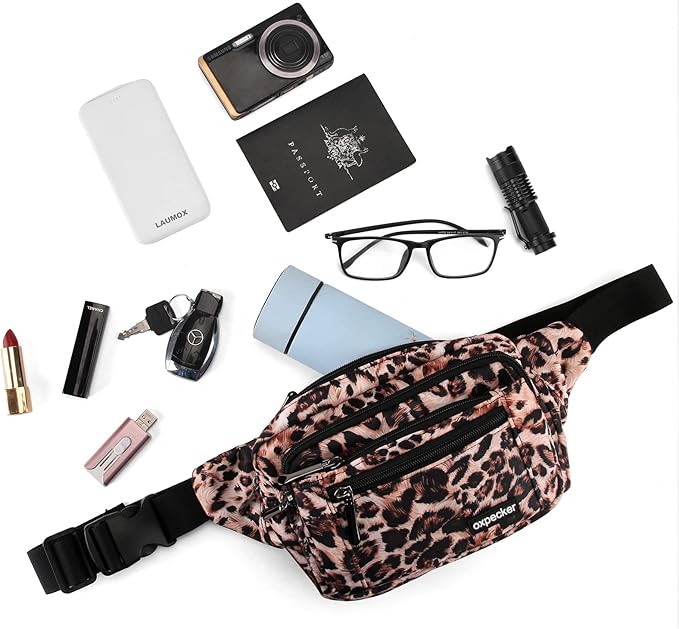 Oxpecker Waist Pack Bag with Rain Cover, Waterproof Fanny Pack for Men&Women, Workout Traveling Casual Running Hiking Cycling, Hip Bum Bag with Adjustable Strap for Outdoors (Leopard print)