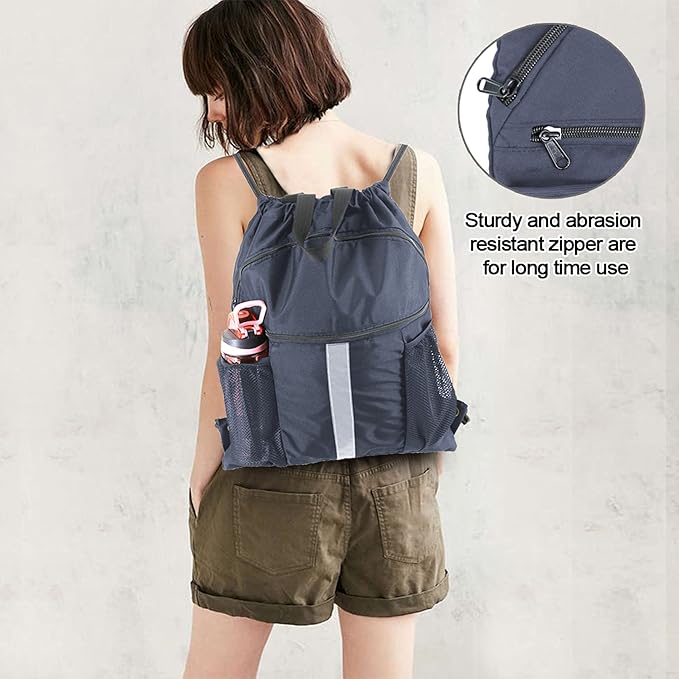 - GOOD WORKMANSHIP: These workout bags for gym women are double stitches for all seams, metal eyelets for reinforced corners. Thick strong string cords, reinforce high density PP webbing, custom zipper for long time use. Good Workmanship: The grey drawstring backpack is double stitches for All seams, Metal Eyelets for reinforced corners. Thick strong string cords, reinforce high density PP webbing, custom zipper for long time use.