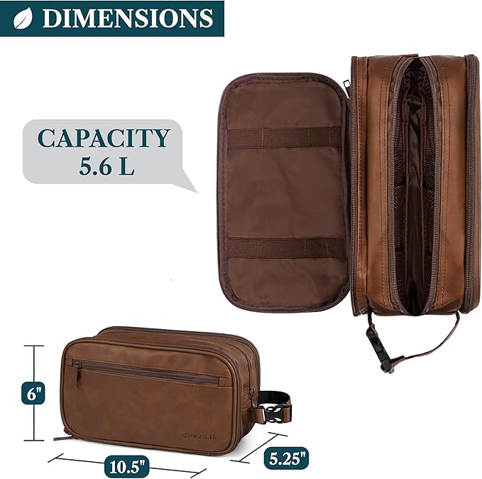 • WATER RESISTANT TOILETRY BAG DOPP KIT: This toiletry case kit is made from high density PU leather with added side padding for durability and extra protection to keep your toiletries safe and protected during travel. The lining is water-resistant to prevent liquid splashes from entering the bag or luggage. The toiletry bag also offers excellent wet/dry separation so you can keep wet accessories in a separate compartment from dry toiletries during camping, road trips, weekenders.