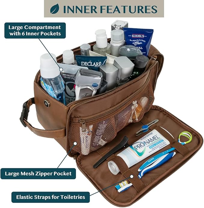 - MENS TOILETRY BAG: This functional PU leather toiletry travel bag has a large compartment and side pockets with additional pockets to hold all your toiletry, shaving, and grooming accessories. Equipped with elastic bands and additional mesh pockets to keep your hygiene items secured while traveling or at home, this cosmetic make up case will help you stay organized.