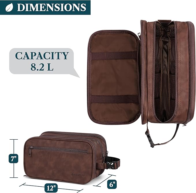 • WATER RESISTANT TOILETRY BAG DOPP KIT: This toiletry case kit is made from high density PU leather with added side padding for durability and extra protection to keep your toiletries safe and protected during travel. The lining is water-resistant to prevent liquid splashes from entering the bag or luggage. The toiletry bag also offers excellent wet/dry separation so you can keep wet accessories in a separate compartment from dry toiletries during camping, road trips, weekenders.