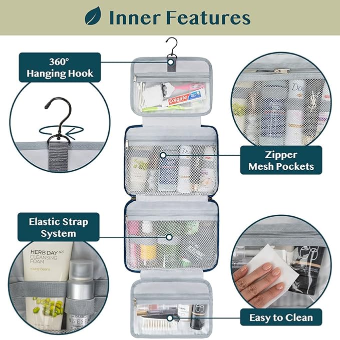 - HANGING COSMETICS TRAVEL BAG ORGANIZER: This toiletry bag for women has a hanging hook and multiple pockets that help you stay organizer during business trip, vacation travel. The hanging hook makes it easy to hang the toiletry bag to bars in the hotel shower bathroom. Unzip your toiletry bag to reveal compartments to organize your shampoo, skincare face hygiene products. This toiletry travel bag is an essential accessory for cruise in Europe, plane, Hawaii Trip, and honeymoon.