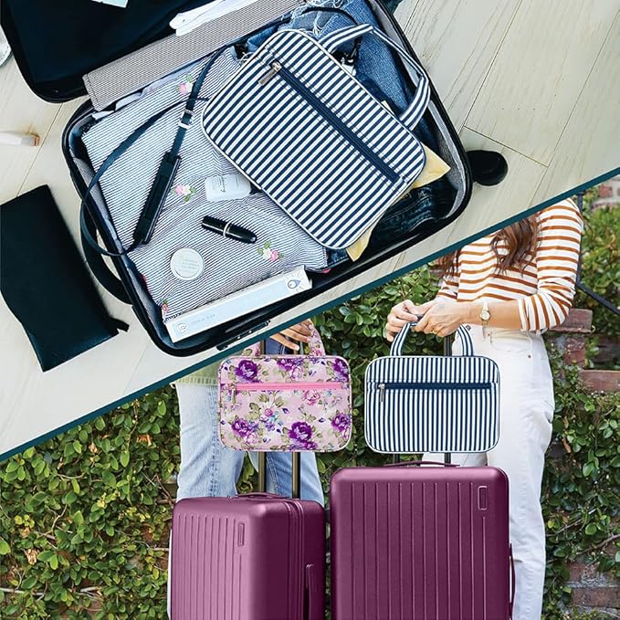 PAVILIA Hanging Toiletry Bag Travel Bag Women Men, Foldable Cosmetic Organizer, Roll up Makeup Bag, Water Resistant Accessories Toiletries, Large Travel Essentials Kit (Navy Stripe)
