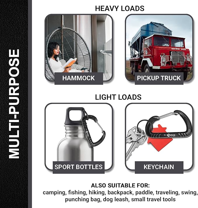 - 【Multi Purpose】 Rhino locking Carabineers are suitable for: hammock, camping, fishing, hiking, backpack, paddle, traveling, swing, punching bag, dog leash, attach sports bottles, yeti sling, keychain, travel tools, fix heavy object on a pickup truck, backpack clips for kids, keychain for women, bag hook, snap hooks, key clip for men, accessory & keychain carabiners, gear ties, toy grappling hook, cable machine accessories, key holder, d ring, boxing bag. Not For Climbing.