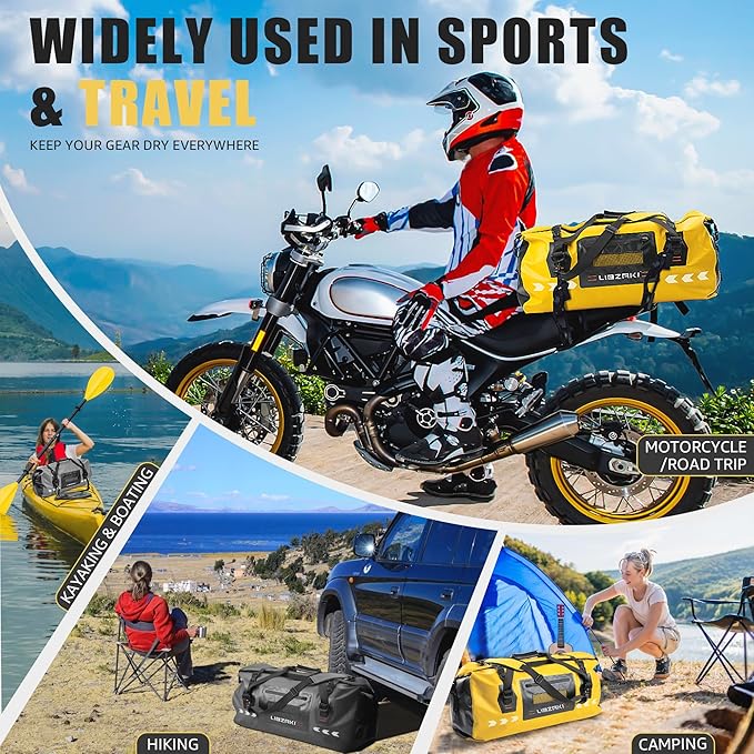 - 【EASE OF USE & STORAGE】: Durable zipper closure and reinforced top carry handles with an exterior mesh zippered pocket and interior pockets for quick access to items and a place for essentials such as keys or a cell phone. Oversized opening and spacious interior simplify loading. Waterproof travel duffel bag folds for easy storage when not in use. Equipped with four quick-release straps, it is easy to secure the duffel bag anywhere on your motorcycle, kayak, or bike.Easy to clean and wipe down for instant shine.
