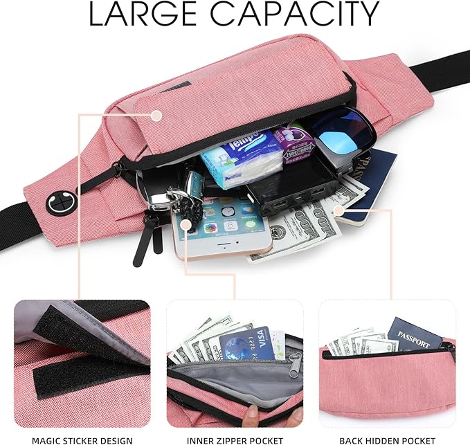 • 【Large Capacity】Our fanny pack size is about 10"x 2.5" x 4.5" inches and has 5 zippered pockets.Large fanny pack can carry all sizes of smartphones, keys, cash, cards, headphones, passports and small valuables.