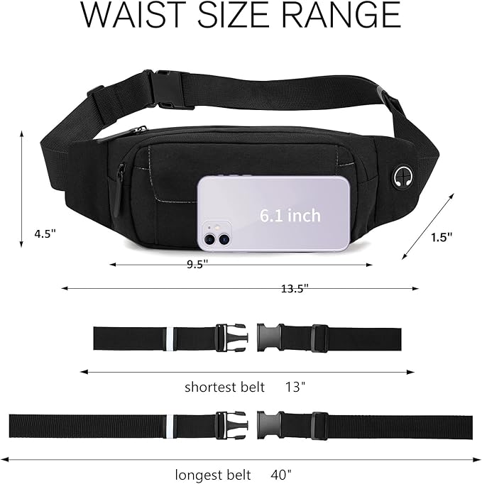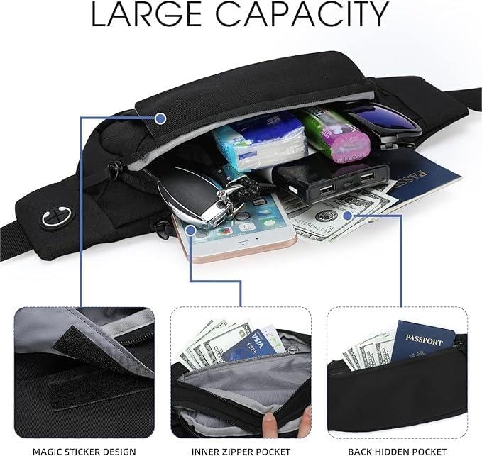 - 【Large Capacity】Our fanny pack size is about 10"x 2.5" x 4.5" inches and has 5 zippered pockets.Large fanny pack can carry all sizes of smartphones, keys, cash, cards, headphones, passports and small valuables.