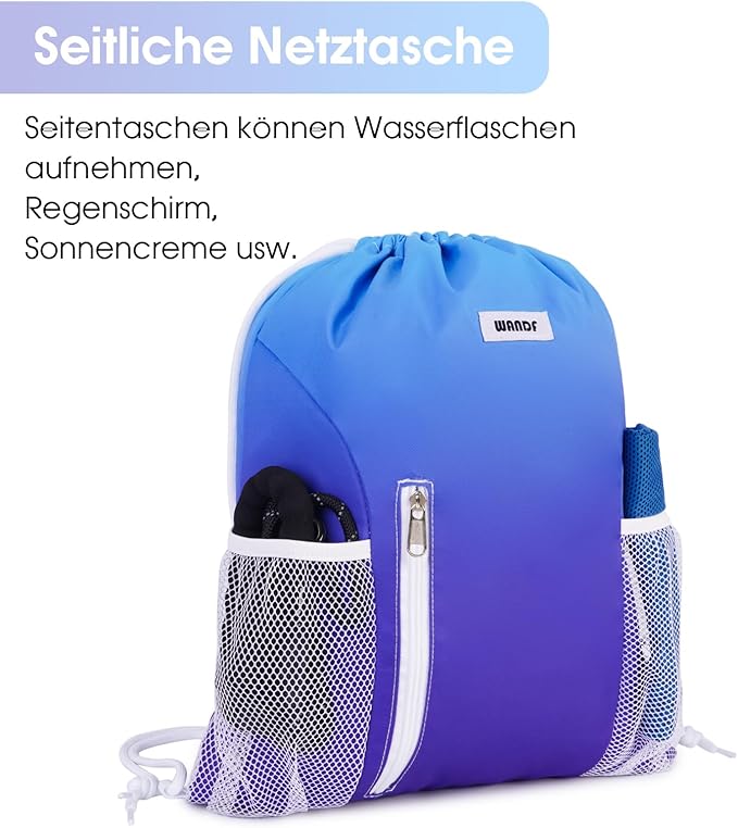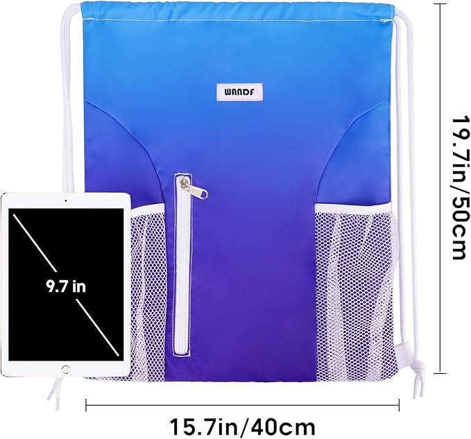 - LARGE CAPACITY--- WANDF drawstring backpack for men&women with large compartment measures 15" x 17", which is big enough for basketball, gym clothing, sport towel, ipad, textbooks and daily supplies. Two mesh side pockets can be used to hold your water bottle and umbrella.