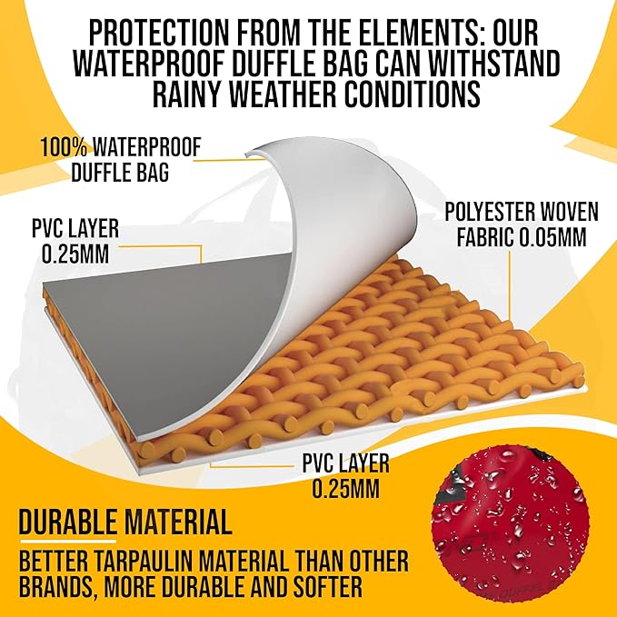 - KEEP YOUR GEAR DRY & PROTECTED ANYWHERE: Fully welded seams, waterproof PVC, and secure zippers shield your essentials from water, dust, and dirt. Whether kayaking, camping, or traveling, this waterproof duffle bag ensures your gear stays safe and ready.