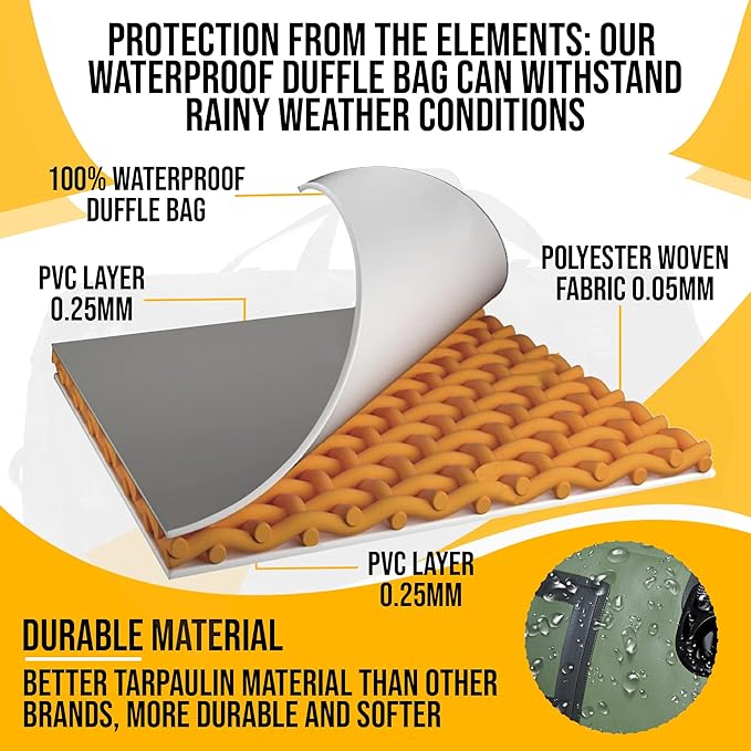 - KEEP YOUR GEAR DRY & PROTECTED ANYWHERE: Fully welded seams, waterproof PVC, and secure zippers shield your essentials from water, dust, and dirt. Whether kayaking, camping, or traveling, this waterproof duffle bag ensures your gear stays safe and ready.