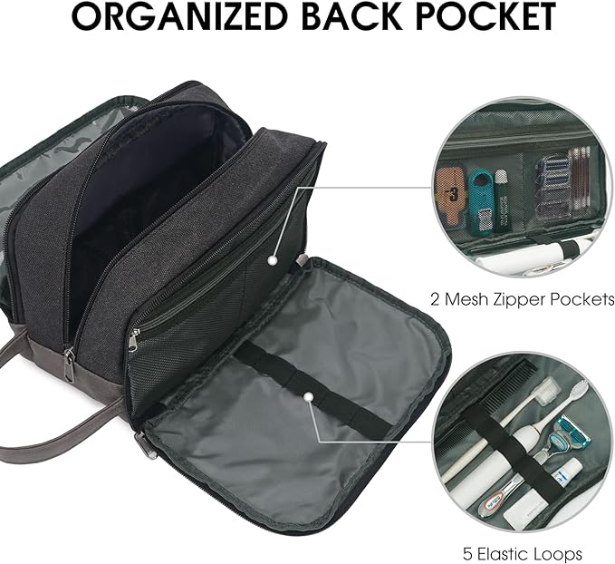 - Easy to Carry - Crafted from durable canvas with PU leather trim, this toiletries bag pairs rugged strength. The water-resistant fabric helps protect your essentials, while the leather handle makes it easy to carry or hang on the go.