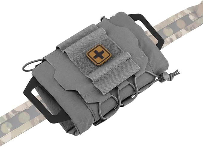 - Features loop panels on med roll carrier pouch for label patches (Medical Cross Patch included).“Mini” MOLLE allows for precise fit on belts as narrow as 1.5” or two-row MOLLE panels. Elastic loop outside to carry your small medic kit