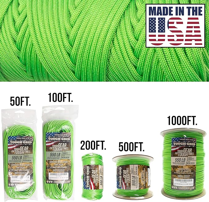 TOUGH-GRID Premium Neon Green Paracord 550 lbs Made in USA Outdoor Survival Nylon Rope Tactical Heavy Duty Strands Parachute Cord Used by US Military Type III Mil-Spec