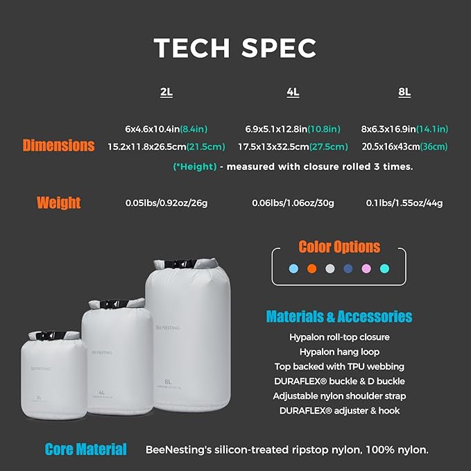- Convenient 3 Pack -Includes 2L (15.2x11.8x26.5cm/6x4.6x10.4in), ideal for first aid essentials (avoid hard or sharp objects), gloves/beanie hats; 4L (15.2x11.8x26.5cm/6.9x5.1x12.8in), perfect for a shell jacket, gloves/beanie hat, or day-hiking essentials; and 8L (20.5x16x43cm/8x6.3x16.9in), suitable for a two-season down sleeping bag or quilt, or dry clothes for backpacking.