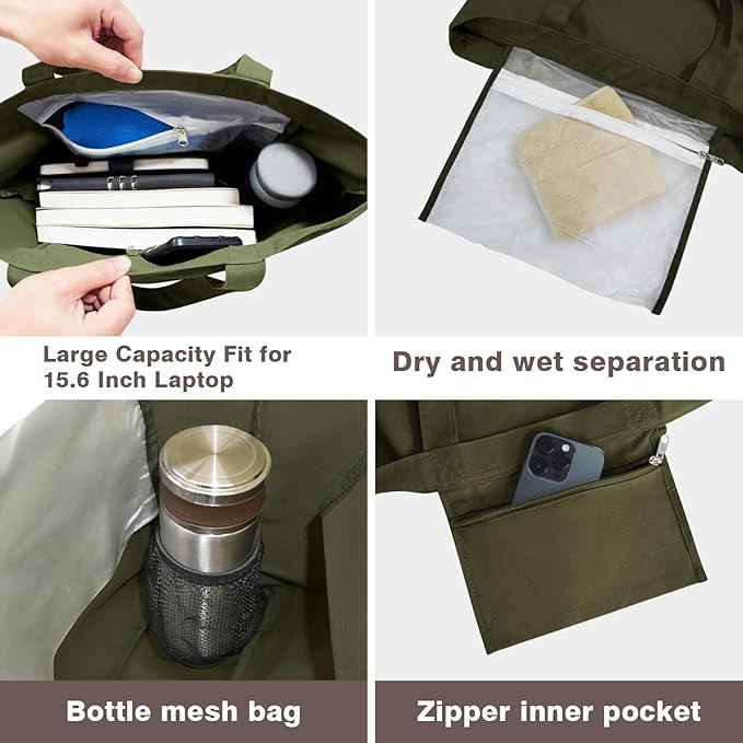 - Multiple Pocket Design: Zipper inner pocket for cellphone, money, keys and small items. Wet and dry separation pockets for towels, dirty clothes, etc. Water bottle fixed mesh bag