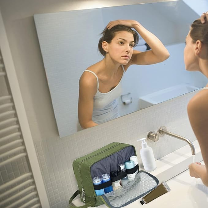 - 【ORGANIZED COMPARTMENTS】 --- Main compartment that holds larger items such as shampoo bottles or shaving cream. One zippered mesh pouch that keeps your smaller toiletries and cosmetics in a place visible and breathable. Other side front zipper pocket that provides extra storage with easy.